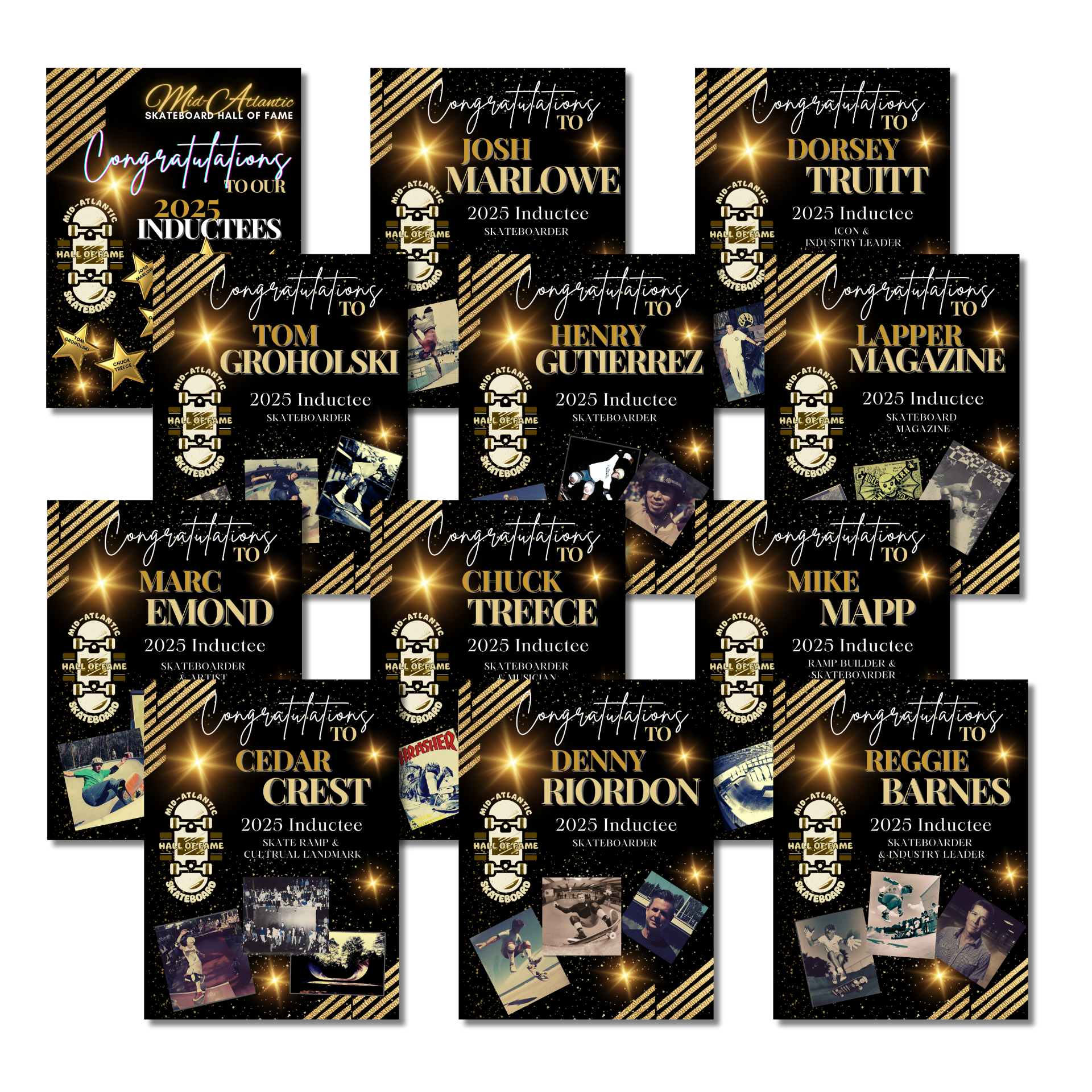 Beautiful, glossy professional frame-worthy 24" x 18" posters of the 2025 Inductees of the Mid-Atlantic Skateboard Hall of Fame.