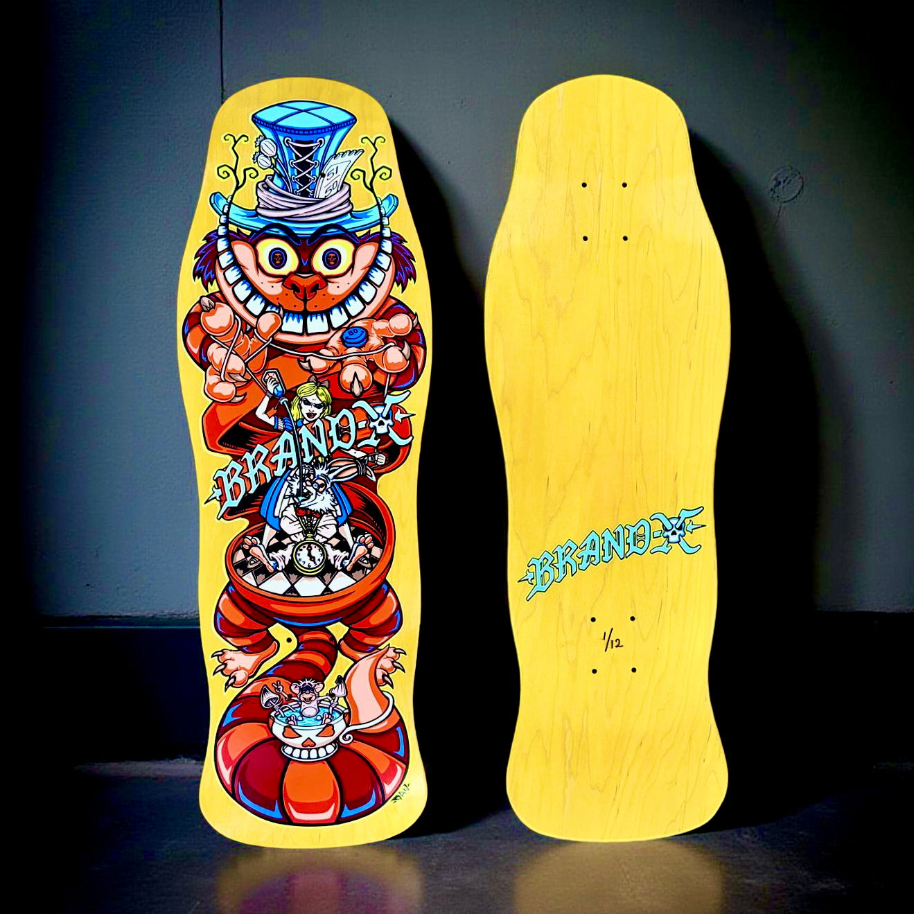 CHICKEN & WAFFLES EVENT TICKET: Brand-X Master Manipulator by Dan Falconer - Limited Edition Release - with amazing hand done screen printed graphics depicting a world of Alice in Wonderland, 5150 & Cheshire Cat reimagined by Dan Falconer.